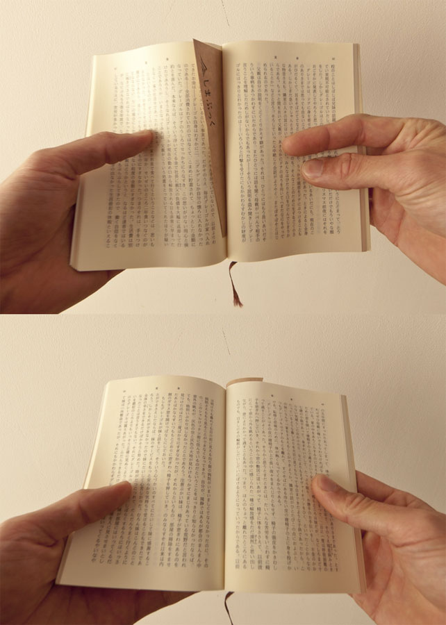 このしおりは三角形になっていて反発力が弱いので本に良くなじんでくれます。先をつまんで上に出しておけばよりなじみますし、しまぶっくさんのロゴが表に飛び出て宣伝に。