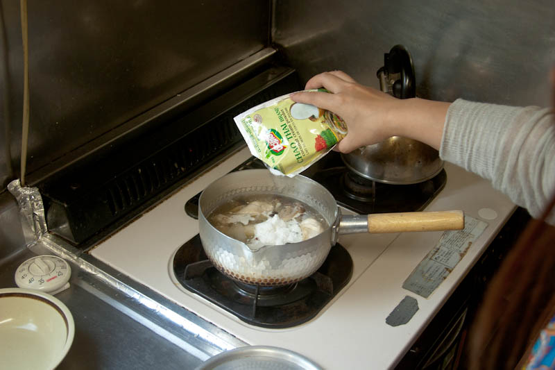 タイではそこらじゅうに自生しているハーブとどこにでも見られるココナッツを使って簡単に作れるスープなのですが、日本ではハーブもココナッツもあまり見かけません。日本で作る場合はタイの食材店で手に入るドライハーブと粉末状のココナッツミルクを使うとタイの家庭の味を楽しむことができます。